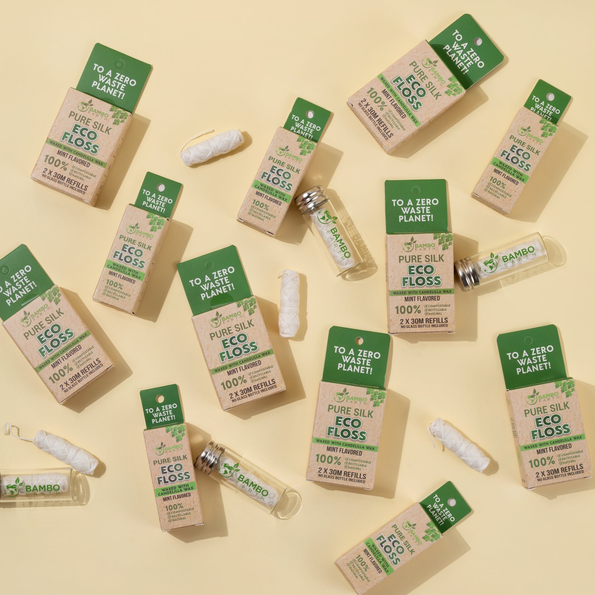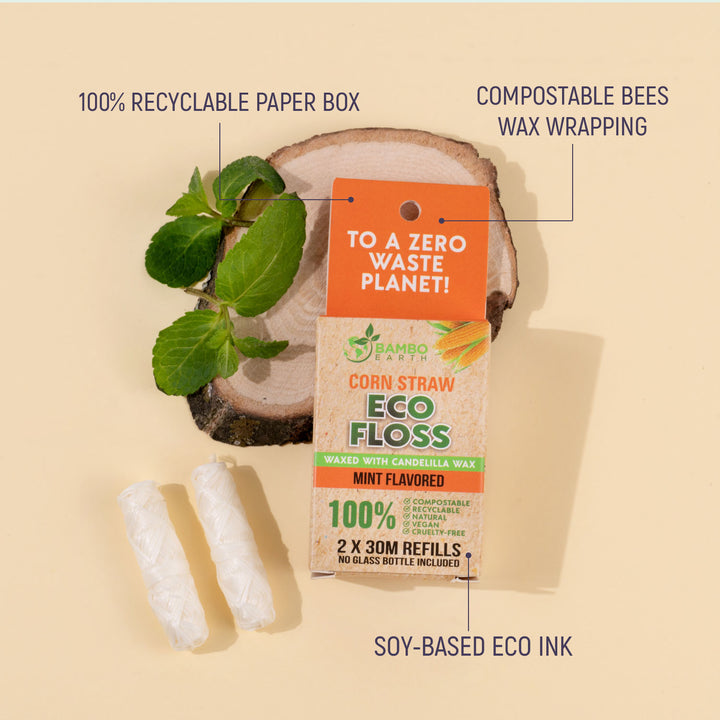 Go green and stay clean with BAMBOEARTH’s vegan corn-based dental floss. Coated in refreshing mint-flavored candelilla wax, it glides easily while being gentle on gums and tough on plaque. 100% compostable and cruelty-free, these refills fit perfectly in your reusable glass jar.