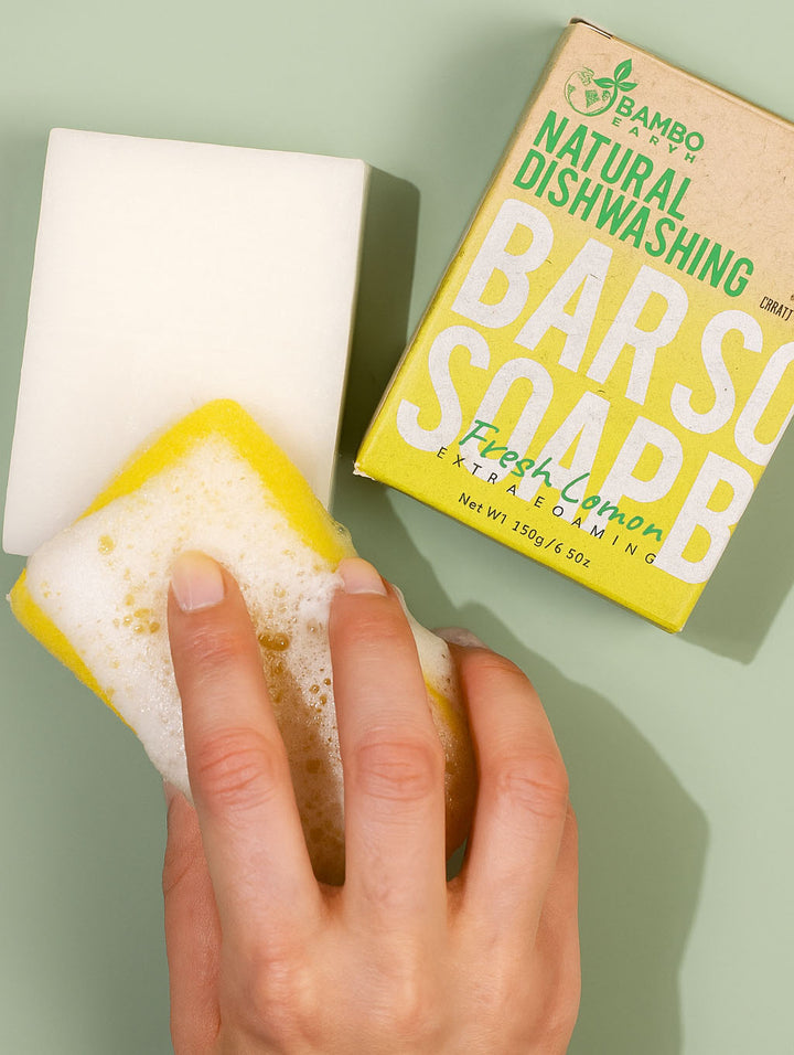 Use the lathered sponge to wash your dishes, pots, and pans as usual. The solid bar effectively cuts through grease and grime!